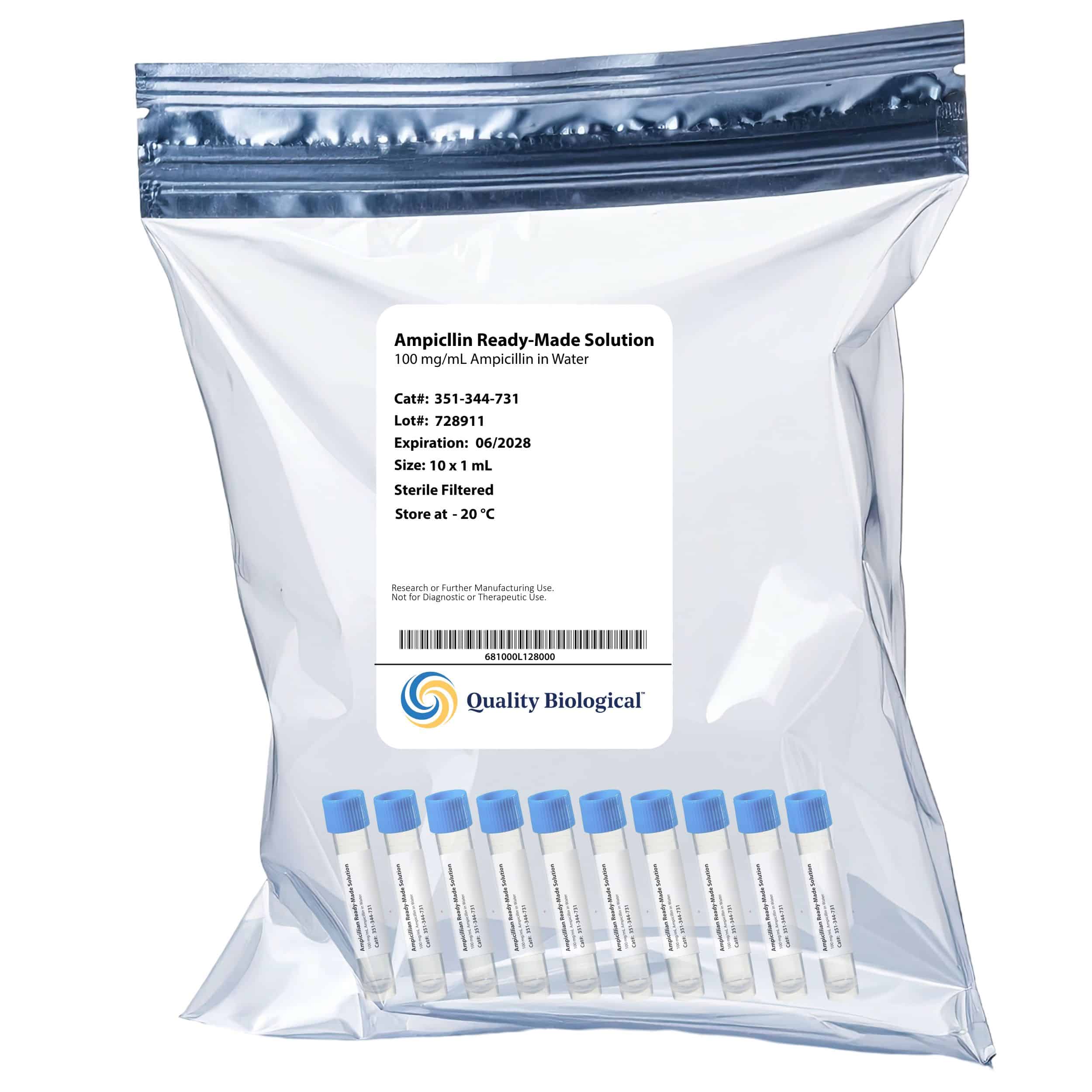 Ampicillin in a convenient ready-to-use solution useful in selecting for ampicillin-resistant bacteria. Ampicillin is a β-lactam antibiotic with an amino group side chain attached to the penicillin structure.