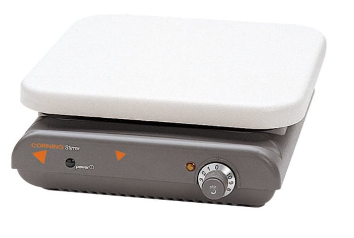 These Corning® PC-611 stirrers have an 11 x 11 inch plastic (ABS) top and can stir large volumes of liquid with ease. These stirrers are designed for 5 gallon vessels (19L), but can stir up to 10 gallons and can handle many applications that previously required an overhead stirrer. This powerful stirring is achieved with a very compact design that conserves bench space. The stirrer uses a magnet that is constructed out of rare earth for exceptional coupling strength. The magnet’s strength also centers the stir bar quickly inside the vessel. They operate on 120V/60Hz and are UL and CUL approved to meet needs in North America and other locations with similar requirements.