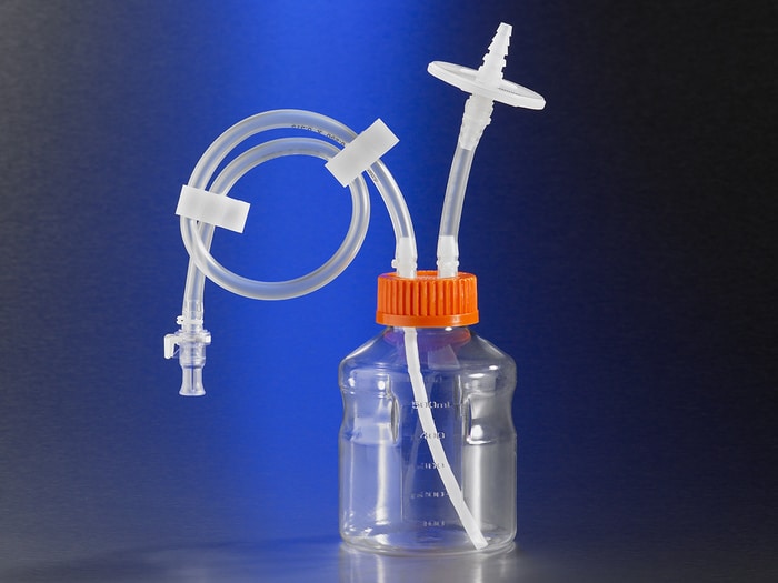 Corning polystyrene Storage Bottles are now available as closed system solutions. They are sterile and arrive individually double-bagged and peassembled. The preassembled transfer caps have two ports. One port ends in a 0.2 µm filter, and the other port is chemically resistant, heat sealable flexible tubing, ending in a Male MPC. The dip tube reaches all the way to the bottom of the flask for easy aseptic transfer of your liquid handling processes.