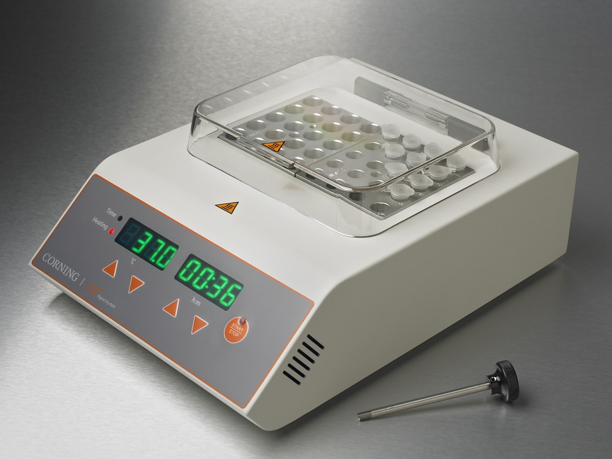 The Corning Digital Dry Bath Heaters are available in single, dual, and four block configurations and provide a broad temperature range up to 150°C, which makes them useful for a variety of applications in molecular biology, histology, clinical, environmental, and industrial laboratories. They have been designed to incorporate the best combination of features including block capacity, dual displays, and an external temperature probe that gives life science researchers the confidence and efficiency they need when working with precious samples.