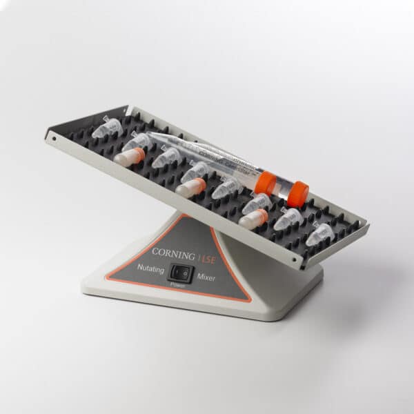 The Corning® LSE™ Nutating Mixer is a compact mixer that combines the motion of an orbital shaker and a platform rocker to produce a continuous three dimensional agitative gesture. The output demonstrates a thorough yet gentle mix without foaming. The pitch and speed of the Corning Nutating Mixer are designed to provide the optimal motion for mixing and resuspending samples in small volume vessels such as blood and centrifuge tubes. The dimpled mat on the platform surface holds tubes firmly in place while the unit is powered on.