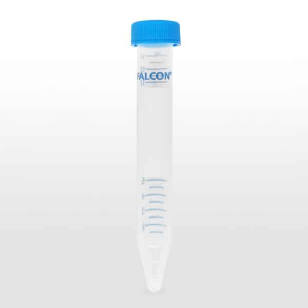 Falcon® 15 mL polystyrene conical centrifuge tubes have a 1,800 RCF rating. The tubes come with polyethylene dome seal screw caps. These sterile tubes are packed 50 per rack and 500 per case. RNase/DNase-free.