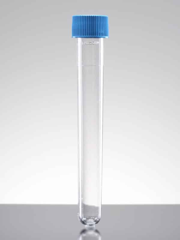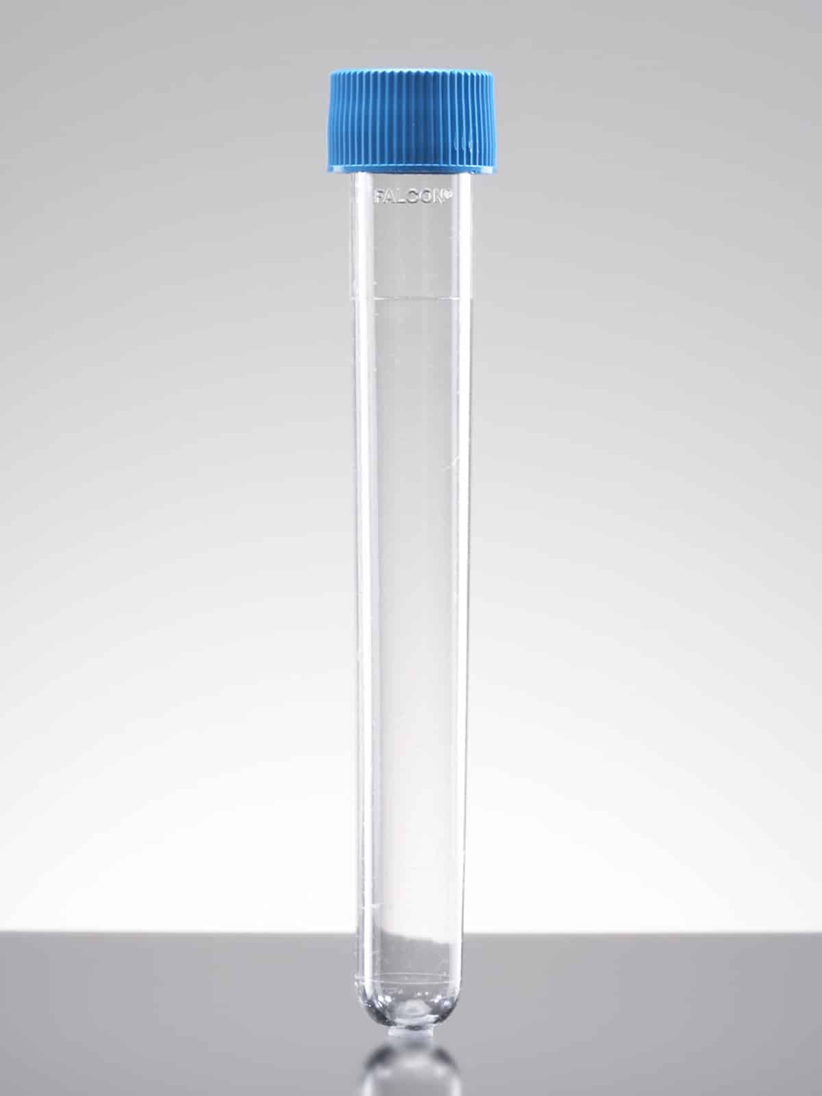 Falcon® 13 x 100mm, 8 mL polystyrene round bottom test tubes have a 1,400 RCF rating. These sterile tubes come with screw caps and are sold 125 per pack and 1,000 per case. RNase/DNase-free.