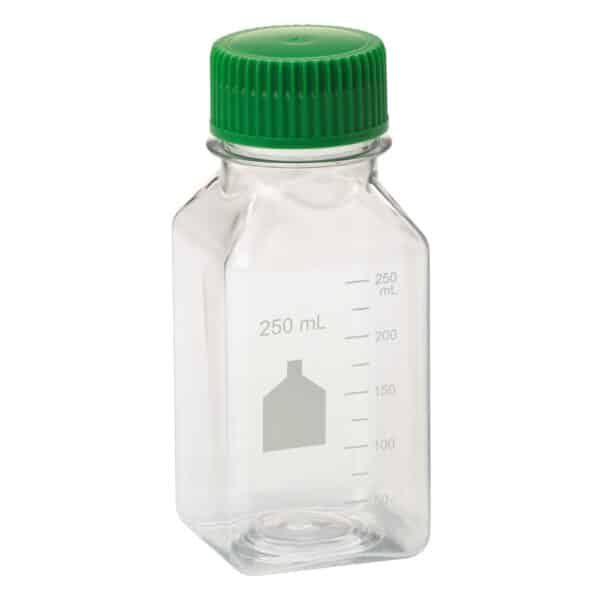 CellTreat 250mL Square Media Bottles in PET are individually wrapped and sterile. The PET material is easier and safer to handle than glass. It also reduces gas permeability and improves solution stability compared to polystyrene.