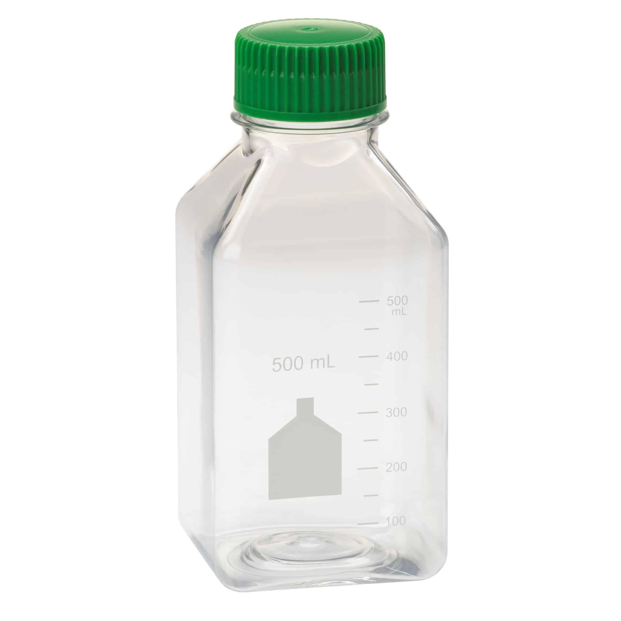 CellTreat 500mL Square Media Bottles in PET are individually wrapped and sterile. The PET material is easier and safer to handle than glass. It also reduces gas permeability and improves solution stability compared to polystyrene.