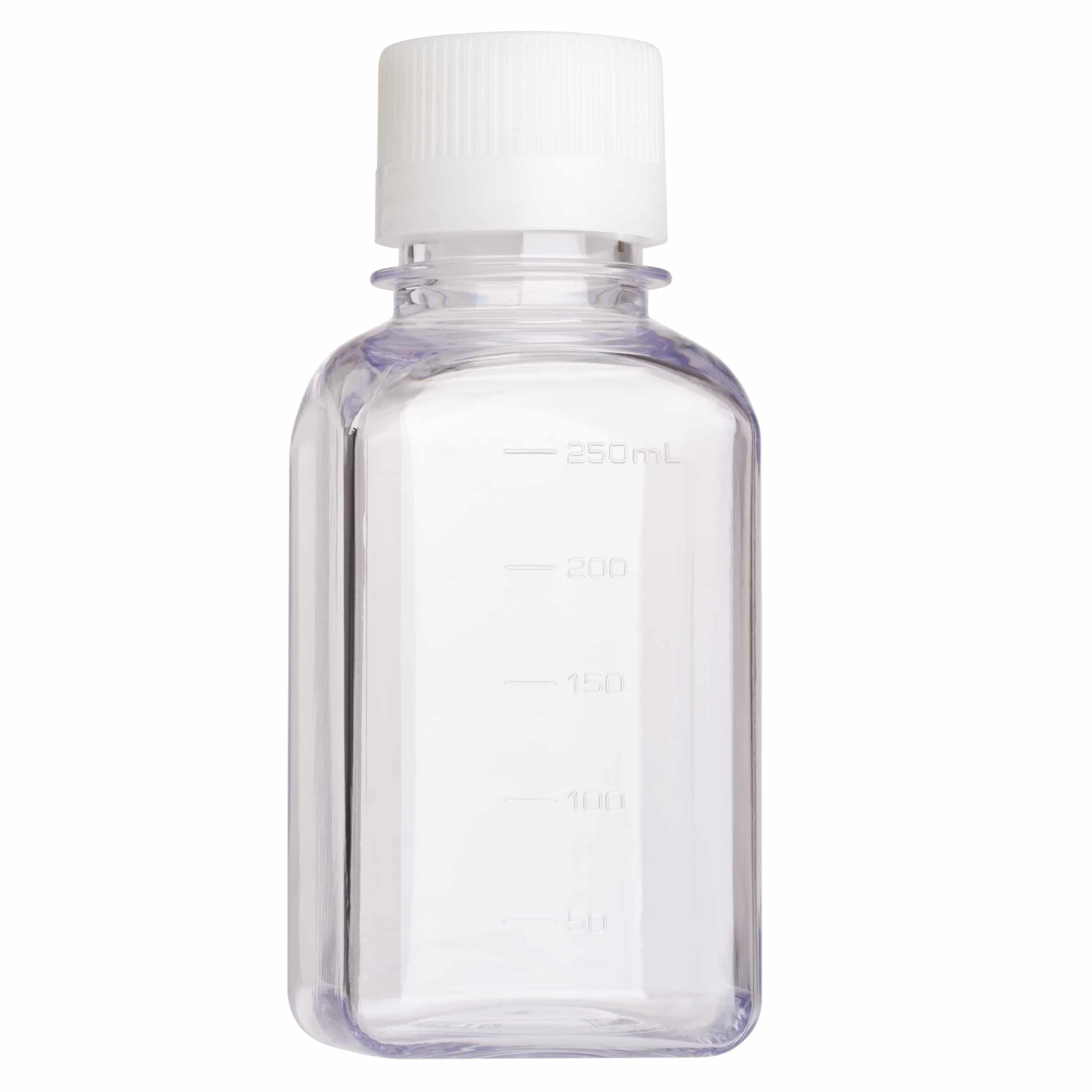 CellTreat (230763) Square Media Bottle, PETG, 250mL, Sterile are bulk packed and manufactured from lightweight plastic material that is easier and safer to handle than glass. The square media bottle shape conserves space in refrigerated storage areas.