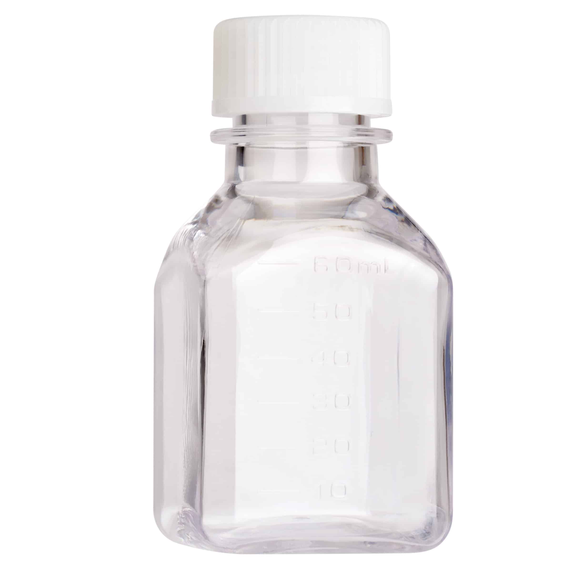 CellTreat (230761) Square Media Bottle, PETG, 60mL, Sterile are bulk packed and manufactured from lightweight plastic material that is easier and safer to handle than glass. The square media bottle shape conserves space in refrigerated storage areas.
