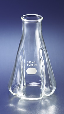 These 1.5 L PYREX® trypsinizing flasks are used for converting homogenous tissue samples into cell suspensions by digestion of connective proteins. Heavy beaded neck accepts cotton plugs. Four extra-deep baffles enhance vigorous agitation.