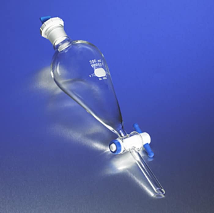 PYREX® 125 mL Pear-Shaped Squibb Separatory Funnel, PTFE Product Standard Stopcock, Polyethylene Standard Taper Stopper