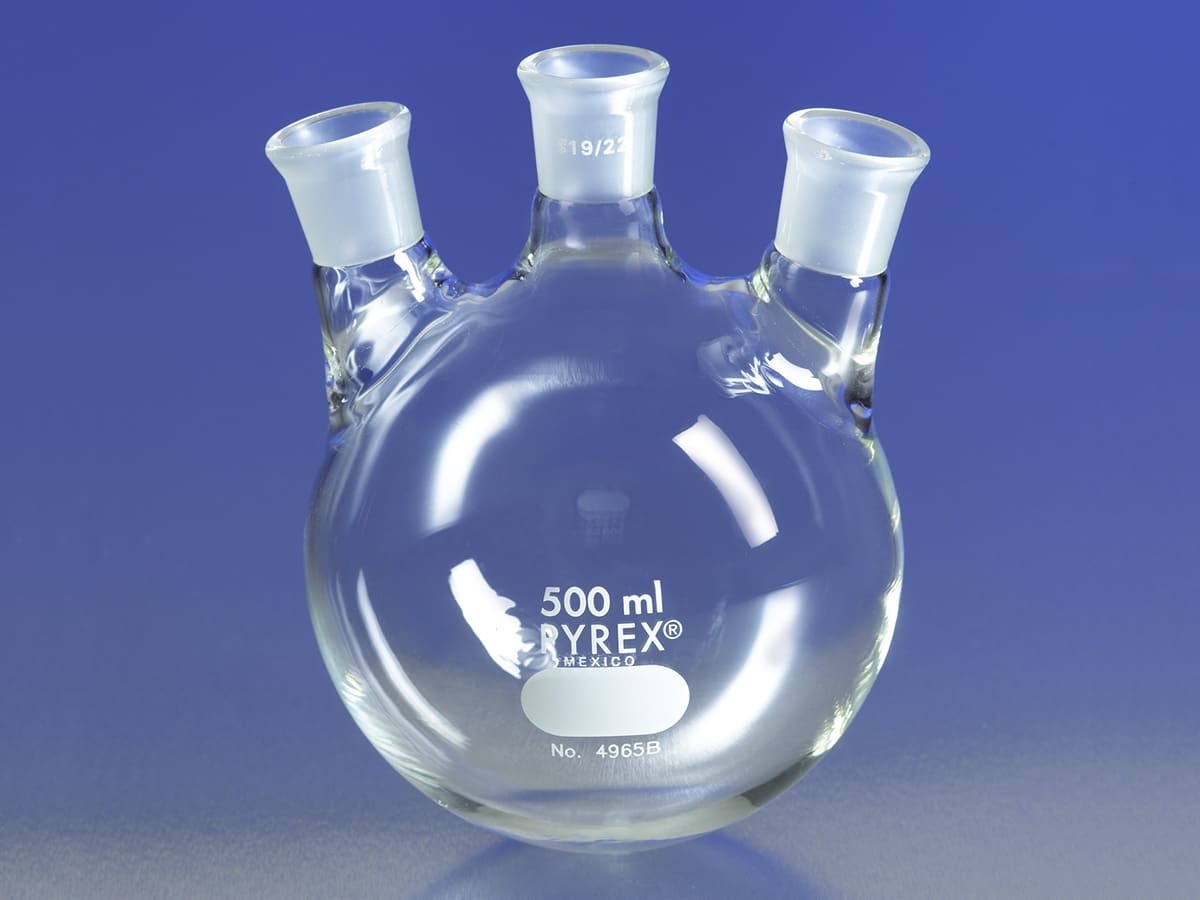 PYREX® 500 mL Three Neck Distilling Flask with 19/22 Center Vertical and Side Angled Neck Standard Taper Joints