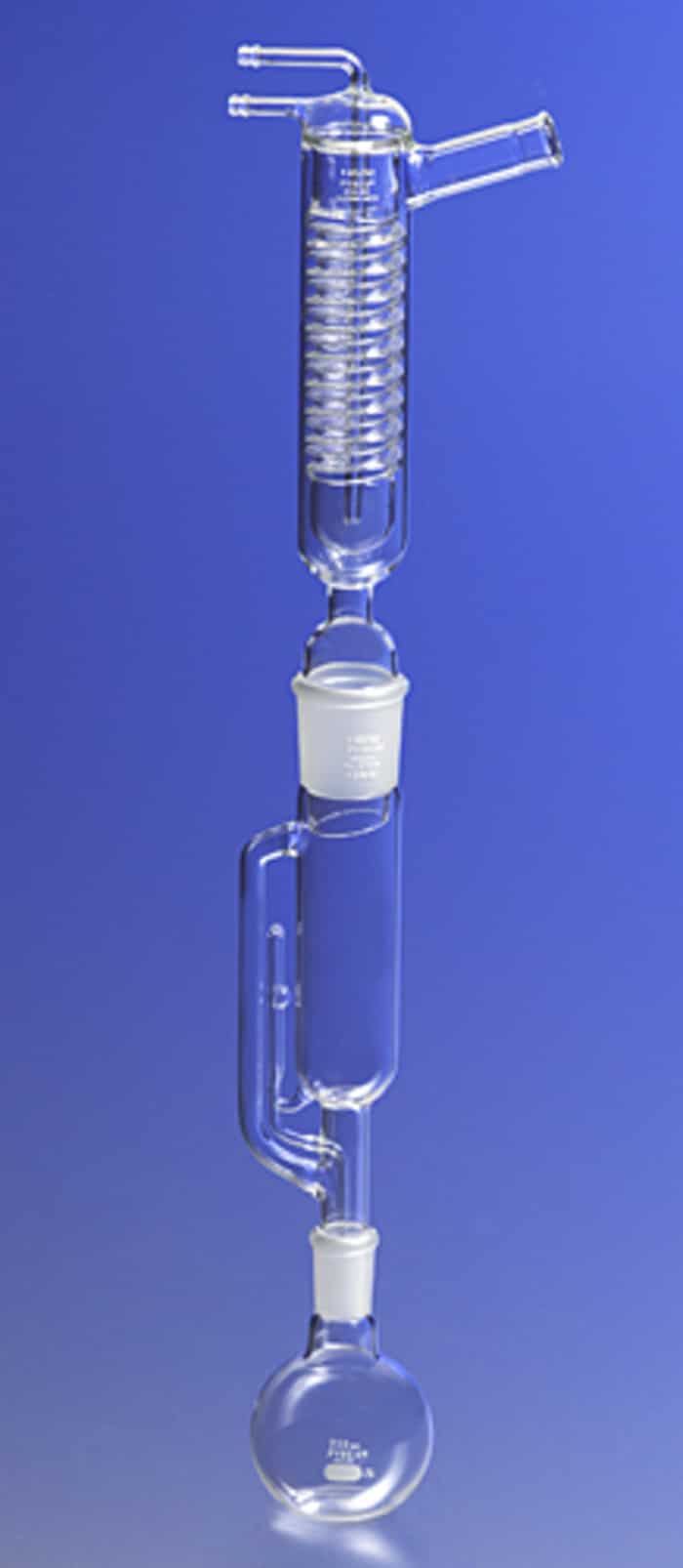 This is an efficient 250 mL PYREX® extraction apparatus for general purpose use. Consists of a Soxhlet extractor with a 24/40 inner Standard Taper joint on the bottom and a 45/50 outer Standard Taper joint on the top, a special Friedrichs condenser with a 45/50 inner Standard Taper joint on the bottom and a flask with a 24/40 outer Standard Taper joint.