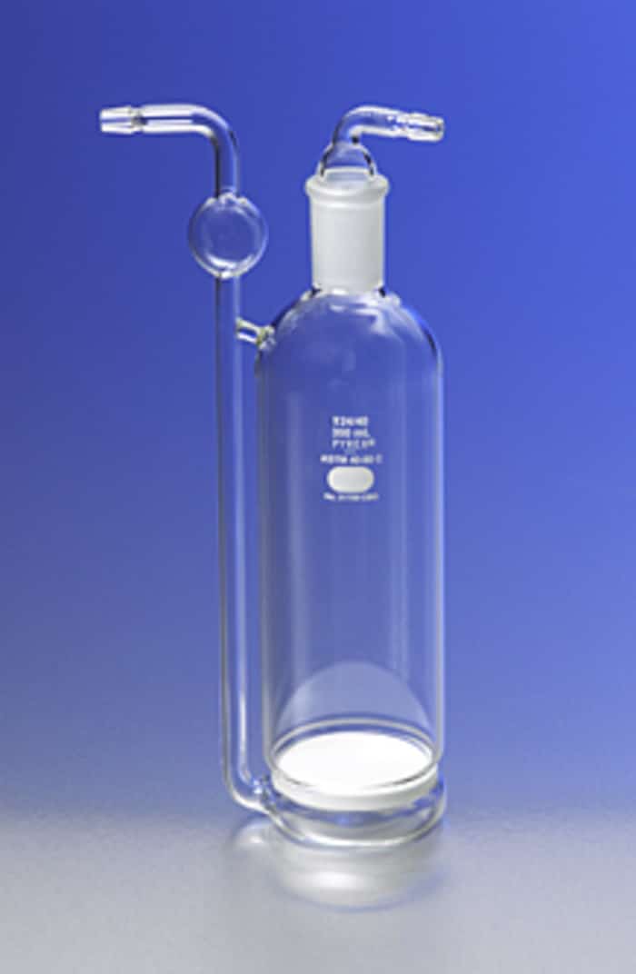 These 350 mL PYREX® gas washing bottles provide an inexpensive but effective method for washing and drying gases. Sidearm tubulations are 10mm O.D. The side inlet tube on this bottle has a rod sealed to the bottle near the top for extra strength. A 24/40 Standard Taper stopper is used to seal the outlet tube to the base. These bottles are a very effective way to humidify carbon dioxide-air mixtures for maintaining high humidity in gassed cell culture incubators. The gas enters the bottle through the top of the outside vertical tube which connects to a 60mm diameter coarse fritted disc at the bottom of the bottle below the surface of the washing medium. After bubbling through the medium, the gas is removed via the sidearm of the bottle stopper. The large diameter fritted disc permits the handling of large volumes of gas and provides greater efficiency and more uniform dispersion of gas bubbles for complete absorption. This coarse frit has a nominal pore distribution of 40 to 60 µm. Please check the Guide to Selecting and Using Fritted Glassware in our Technical Information Listing for additional information on fritted ware.These 350 mL PYREX® gas washing bottles provide an inexpensive but effective method for washing and drying gases. Sidearm tubulations are 10mm O.D. The side inlet tube on this bottle has a rod sealed to the bottle near the top for extra strength. A 24/40 Standard Taper stopper is used to seal the outlet tube to the base. These bottles are a very effective way to humidify carbon dioxide-air mixtures for maintaining high humidity in gassed cell culture incubators. The gas enters the bottle through the top of the outside vertical tube which connects to a 60mm diameter coarse fritted disc at the bottom of the bottle below the surface of the washing medium. After bubbling through the medium, the gas is removed via the sidearm of the bottle stopper. The large diameter fritted disc permits the handling of large volumes of gas and provides greater efficiency and more uniform dispersion of gas bubbles for complete absorption. This coarse frit has a nominal pore distribution of 40 to 60 µm. Please check the Guide to Selecting and Using Fritted Glassware in our Technical Information Listing for additional information on fritted ware.
