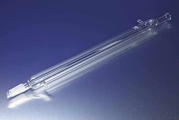 This PYREX® general purpose condenser has a 24/40 Standard Taper inner joint at the bottom with a drip tip. Although the condensing area per unit length of the 400mm long jacket is low, the large capacity water jacket gives efficient cooling. They can be used for either distillation or extraction. Condenser tubulations are approximately 10mm O.D.