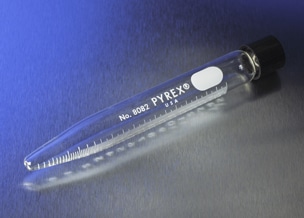 These 50 mL PYREX® conical centrifuge tubes have white enamel graduations for durability. The 15 mL size is graduated upward from the tip in 0.1 mL divisions. The 50 mL size is graduated upward from tip to 10 mL in 0.5 mL divisions, and from 10 to 50 mL in 1 mL divisions. The phenolic 24-410 GPI threaded screw cap is fabricated of a resin that is specially formulated to resist the effects of temperature and steam. Caps have a glued-in, white rubber liner. For replacement caps, see No. 9999.