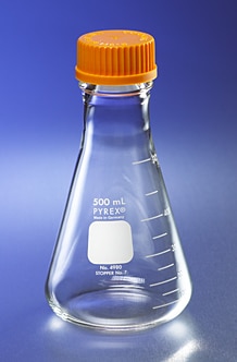 These wide mouth PYREX® 500 mL Erlenmeyer flasks have a large, 29mm neck opening which makes it easy to use larger volume serological pipets. Ideal product for use as a shaker flask or for media prep and storage needs. They also have a single size linerless, one-piece autoclavable orange polypropylene plug seal caps with GL45 threads and drip-free pouring rings.