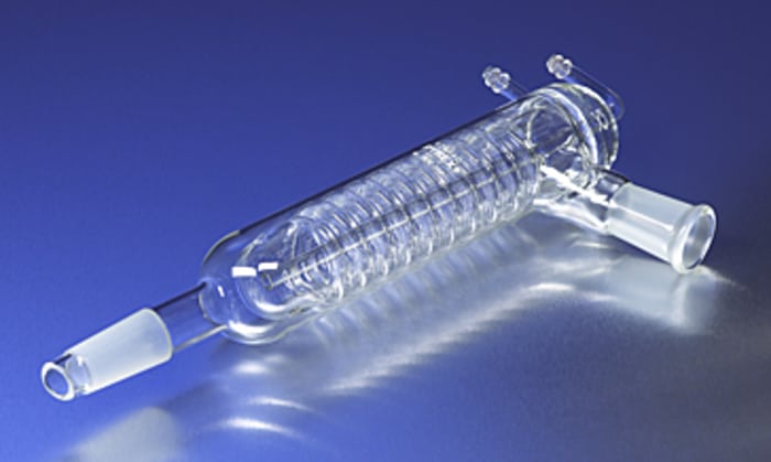 This PYREX Friedrichs type condenser affords very efficient operation. The helical inner tube fits closely within the jacket. The vapor tube is sealed to the jacket at an angle of 75deg and has an outer 24/40 Standard Taper joint.
