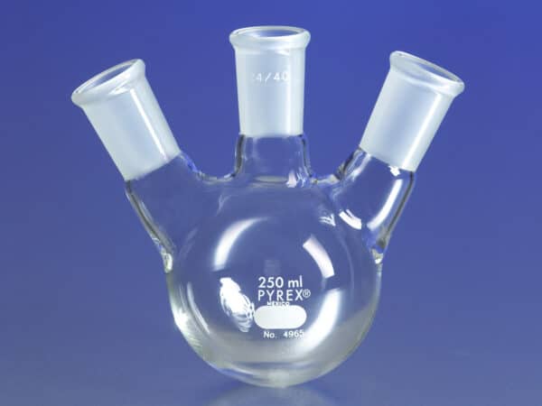These PYREX® three neck flasks have two angled side necks at the same height with Standard Taper outer joints and a larger center neck with a vertical Standard Taper joint.