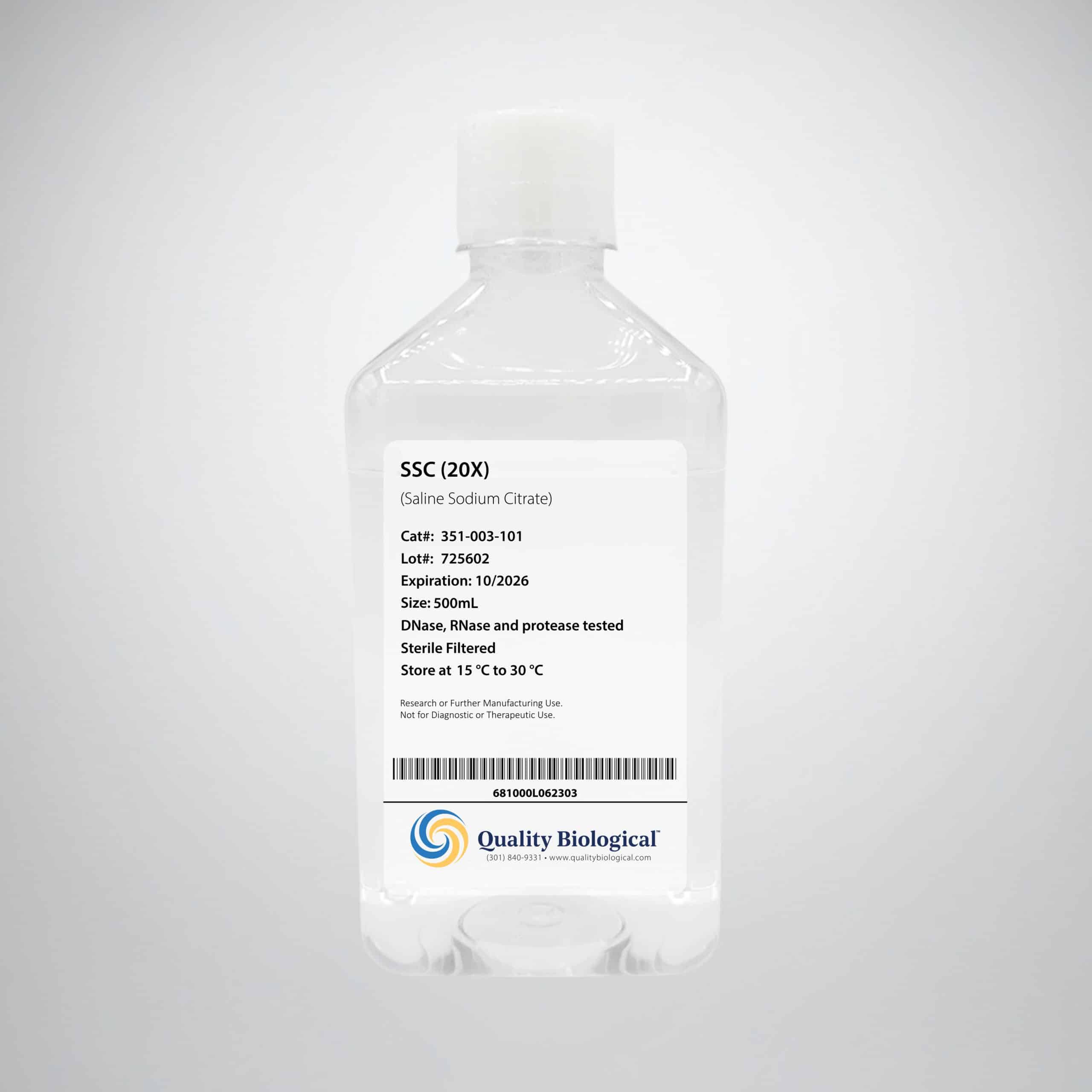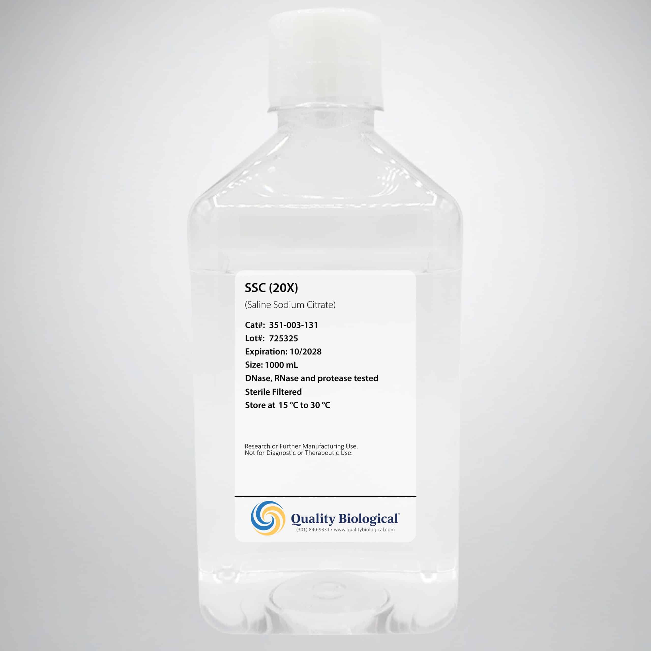 SSC 20X buffer is a ready-to-use standard reagent in Southern and Northern hybridization procedures used to control stringency for the washing steps after hybridization. The concentrated formula can be used straight or diluted to make SSC working solutions with concentrations as low as 0.5X.