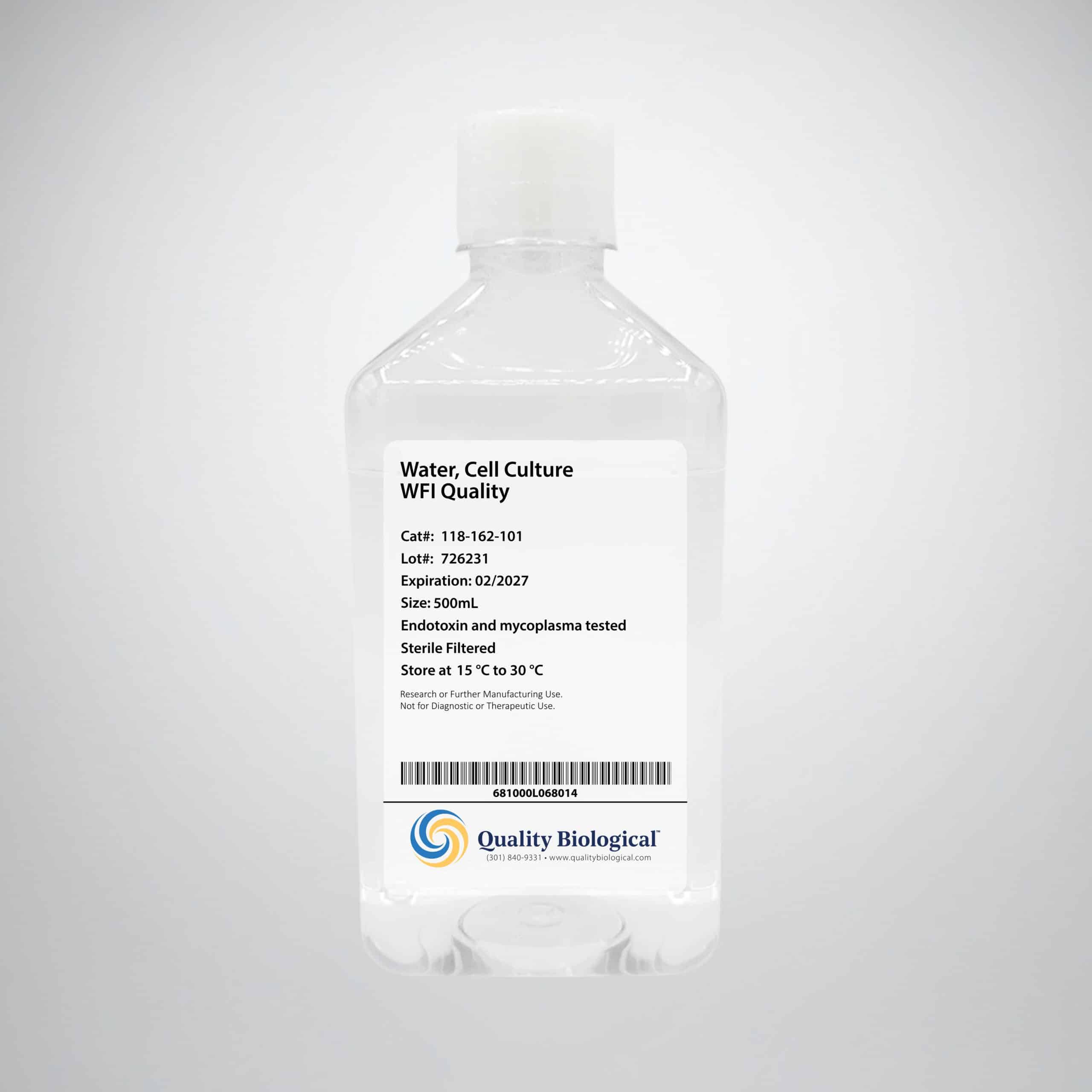 This water is extensively purified by reverse osmosis, subsequently deionized and passed through a filter membrane to remove particles and tested to meet the specifications found in the USP (United States Pharmacopeia) monograph for Water for Injection (WFI) for endotoxin, TOC, and conductivity. It is additionally tested for sterility, mycoplasma, and cell culture performance.